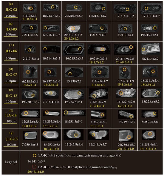 In sample JLG-07, two analytical spots yielded highly discordant ages of 203.8 Ma and 334.8 Ma, which deviate significantly from the main magmatic age range of 236.1–239.6 Ma (Figure 6d, Table 5). Analytical spots 1 (203.8 ± 2.8 Ma) and 2 (334.8 ± 7.1 Ma) in the JLG-07 sample correspond to the rim and core of the same zircon grain, respectively. Analysis of the zircon’s cathodoluminescence (CL) images, transmitted light images, and reflected light images indicates that both spots may be located on or near fractures and inclusions, which could result in anomalously older or younger measured ages. Therefore, these age data are considered unreliable and should not be used to discuss the crystallization age of the rock, nor do they represent magmatic crystallization ages.