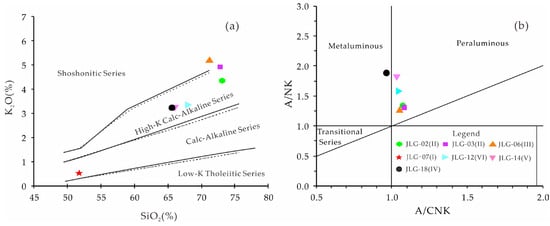 (a) SiO2 vs. K2O diagram (base map after Rickwood et al. [25]); (b) A/CNK vs. A/NK diagram (after Maniar et al. [26]). In (a) solid lines indicate higher reliability, while dashed lines indicate lower reliability.