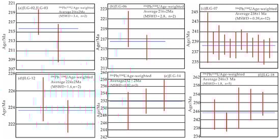 The weighted mean age of magmatic zircons from the same sample is the direct basis for determining the crystallization age of the corresponding pluton. Zircon points plotting in the magmatic field on the La vs. (Sm/La)N diagram (Figure 5h) are identified as magmatic zircons [37]. For sample JLG-02 (Pluton II), only one zircon is magmatic, with an age of 217 ± 3 Ma (Figure 5h, Table 5); for JLG-03 (Pluton II), only one zircon is magmatic, with an age of 213 ± 4 Ma (Figure 5h, Table 5); for JLG-06 (Pluton III), two zircons were used for weighted mean age calculation, yielding a weighted mean age of 216 ± 2 Ma (Figure 11b, Table 5); for JLG-07 (Pluton I), twelve zircons were used for weighted mean age calculation, yielding a weighted mean age of 238 ± 1 Ma (Figure 11c, Table 5); for JLG-12 (Pluton VI), two zircons were used for weighted mean age calculation, yielding a weighted mean age of 224 ± 2 Ma (Figure 11d, Table 5); for JLG-14 (Pluton V), three zircons were used for weighted mean age calculation, yielding a weighted mean age of 252 ± 2 Ma (Figure 11e, Table 5); for JLG-18 (Pluton IV), five zircons were used for weighted mean age calculation, yielding a weighted mean age of 246 ± 3 Ma (Figure 11f, Table 5).