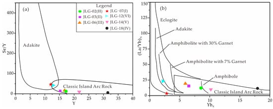 On the Y vs. Sr/Y diagram (Figure 13a), samples from Plutons II (JLG-02, JLG-03), III (JLG-06), IV (JLG-18), and V (JLG-14) plot in the classic island arc rock field. They have low LREE/HREE fractionation ((La/Yb)N = 3.24–22.92, average 13.1, Figure 13b and Table 4), high Sr (210 ppm–550 ppm, average 309 ppm) and Sr/Y ratios (7–45.8, average 19.5), and high Y (>12 ppm) and Yb (>6.64 ppm) contents. These features display the geochemical characteristics of classic island arc rocks to some extent [45]. This is similar to the tectonic setting inferred from their crystallization ages: subduction of the Mianlue Ocean and initial collisional orogeny.