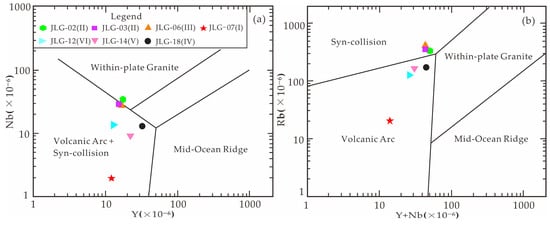 (a) Y vs. Nb diagram; (b) (Y + Nb) vs. Rb diagram for the Jiangligou Plutonic Complex (after Pearce et al. [57]).