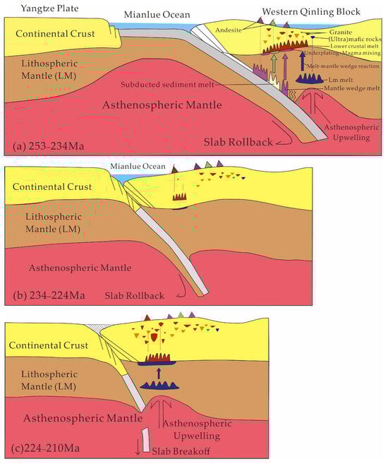 Schematic diagram illustrating the tectonic evolution model of the West Qinling orogenic belt during the Indosinian period. (a) Late Mianlue Ocean subduction, 253–234 Ma: The Yangtze Plate subducts northwestward, and the Mianlue Oceanic crust undergoes slab rollback → Asthenospheric upwelling induces mantle melting. (b) Initial collision, 234–224 Ma: The Mianlue Ocean gradually closes, initial collision occurs between the North China and Yangtze plates, with ongoing slab rollback. (c) Peak collision stage, 224–210 Ma: Intense continental collision leads to slab breakoff → Asthenospheric upwelling induces melting of the thickened crust.