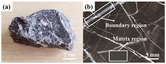The surface appearance and cross-section morphology of typical low-grade limestones is presented in Figure 2. The limestone blocks exhibit distinctive black coloring with the milky interstratified inclusions. Based on the analyses of the minerogenetic conditions and chemical composition, this specimen can be classified as a typical endogenetic sedimentary rock [22]. Furthermore, a large-area dark homogeneous region is observed, interspersed with some bright crisscrossed regions. For analytical purposes, these regions are defined as matrix region and boundary region, respectively.