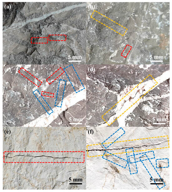 Representative optical images of the progressive evolution of thermal cracks on limestone surfaces during calcination: (a,b) low-temperature stage, characterized by M-SPCs (marked with red boxes) and B-SPCs (marked with orange box), manifested as crack initiation; (c,d) mid-temperature stage, characterized by M-SPCs, B-SPCs and M-BPCs (marked with blue box), manifested as crack propagation and the emergence of M-BPCs; (e,f) high-temperature stage, displayed all three crack types, manifested as crack penetration and network formation.