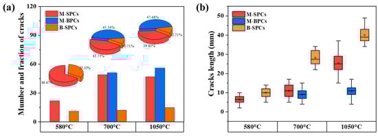 The number, fraction and length of various types of cracks in low-grade limestones after undergoing the calcination at different temperatures were counted to further reveal the principles of crack formation and expansion with temperature. As illustrated in Figure 4a, only M-SPCs and B-SPCs were observed in the low-temperature calcination process, with a ratio of approximately 2:1. During the subsequent mid-temperature calcination stage, the increase in the number of B-SPCs was not significant, whereas that of M-SPCs increased markedly, exceedingly twice the number of this crack type in the previous stage. This suggests that the formation of B-SPCs occurred predominantly during the low-temperature stage. By contrast, M-SPCs have been observed to form in both the low-temperature and mid-temperature stages. Significantly, M-BPCs only began to emerge in substantial numbers at the mid-temperature stage, indicating that a certain temperature threshold must be reached for their formation. After being calcined at a high temperature, the number ratio of the three types of cracks remained essentially unaltered.