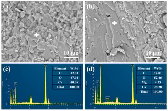 Scanning electron microscope (SEM) morphology and corresponding energy dispersion spectrum (EDS) patterns of low-grade limestone samples selected from different regions: (a,c) matrix region; (b,d) boundary region. The “+” symbols in Figure (a,b) denote the positions analyzed during the EDS point scan.
