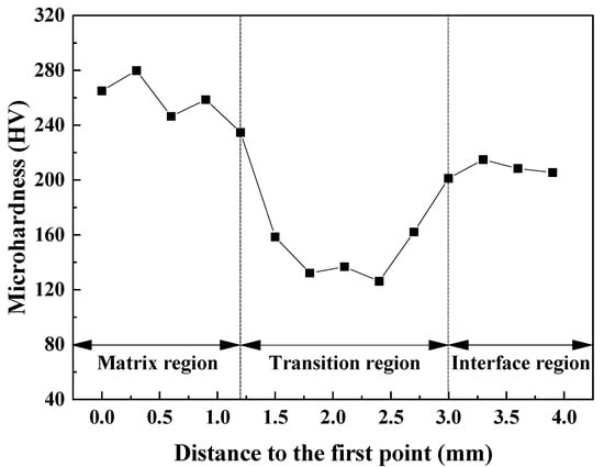 The microhardness of the transition zone between the matrix and interface was measured using the HVS-1000 Digital Display Vickers Microhardness Tester (Shanghai Materials Testing Machine Factory, Shanghai, China). The load of 1 kgf was applied via a diamond indenter for a duration of 10 s. Set a test point at intervals of 0.5 mm, with five tests conducted at each position and the average value taken.