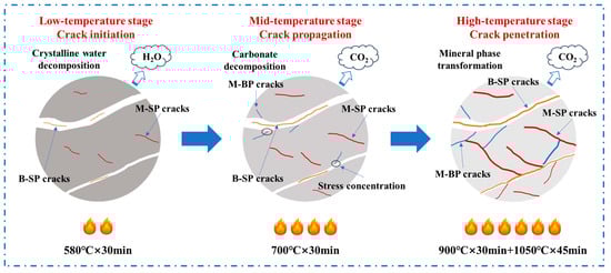 - During the mid-temperature stage, the decarbonation of carbonates generates increased gas pressure and induces crystalline phase transformations. This results in localized pore formation and volumetric shrinkage, which promotes the propagation of existing M-SPCs and B-SPCs and initiates new cracks propagating from boundaries into the matrix (M-BPCs). Compared to the previous stage, the crack lengths for M-SPCs and B-SPCs exhibited an increase of 69.2% and 182.5%, respectively. M-BPCs account for approximately 45.5% of the three crack types.
