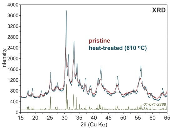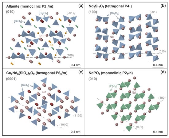 - Reissner, C.E.; Bismayer, U.; Kern, D.; Reissner, M.; Park, S.; Zhang, J.; Ewing, R.E.; Shelyug, A.; Navrotsky, A.; Paulmann, C.; et al. Mechanical and structural properties of radiation-damaged allanite-(Ce) and the effects of thermal annealing. Phys. Chem. Mineral. 2019, 46, 921–933. [Google Scholar] [CrossRef]