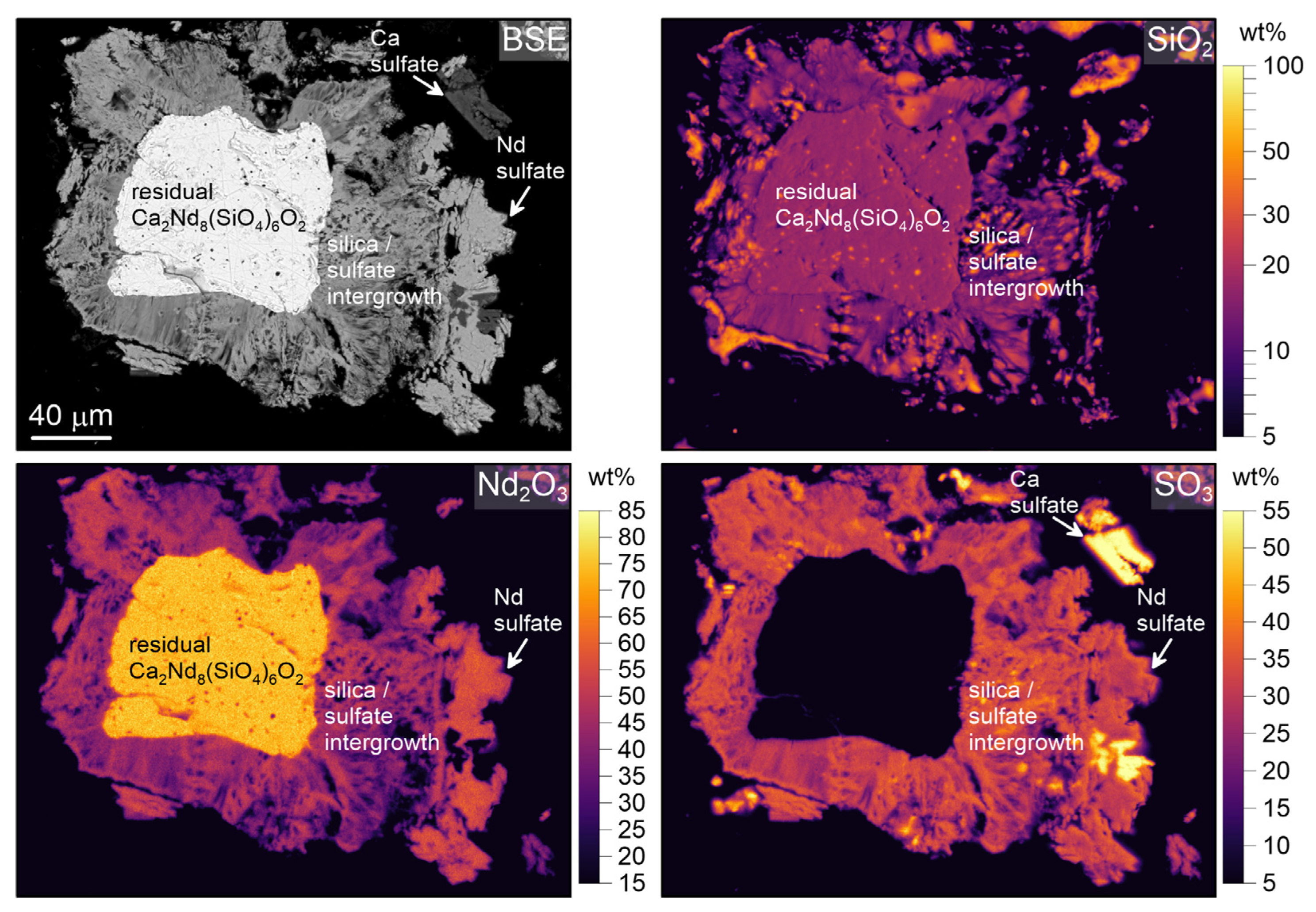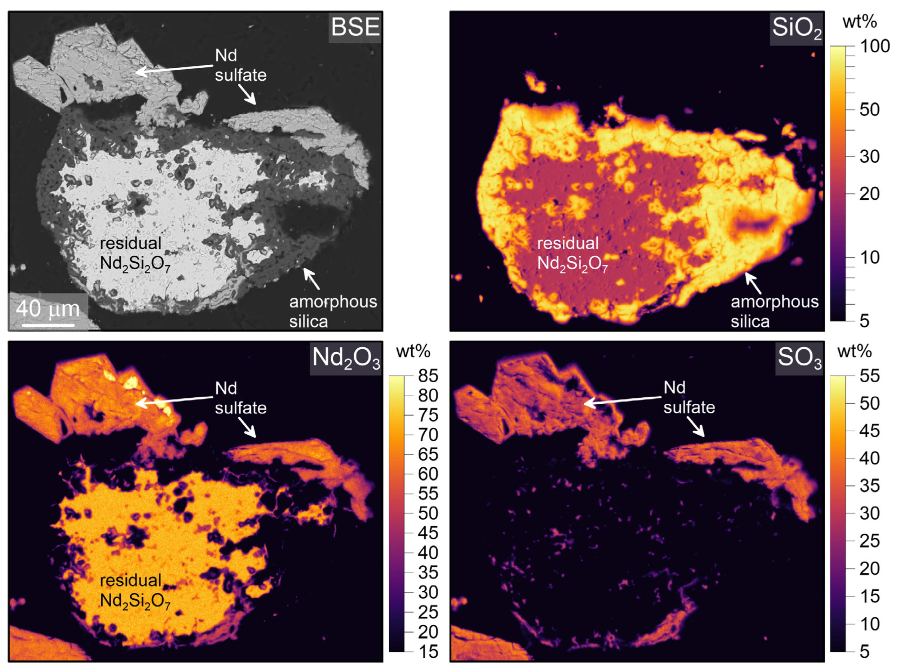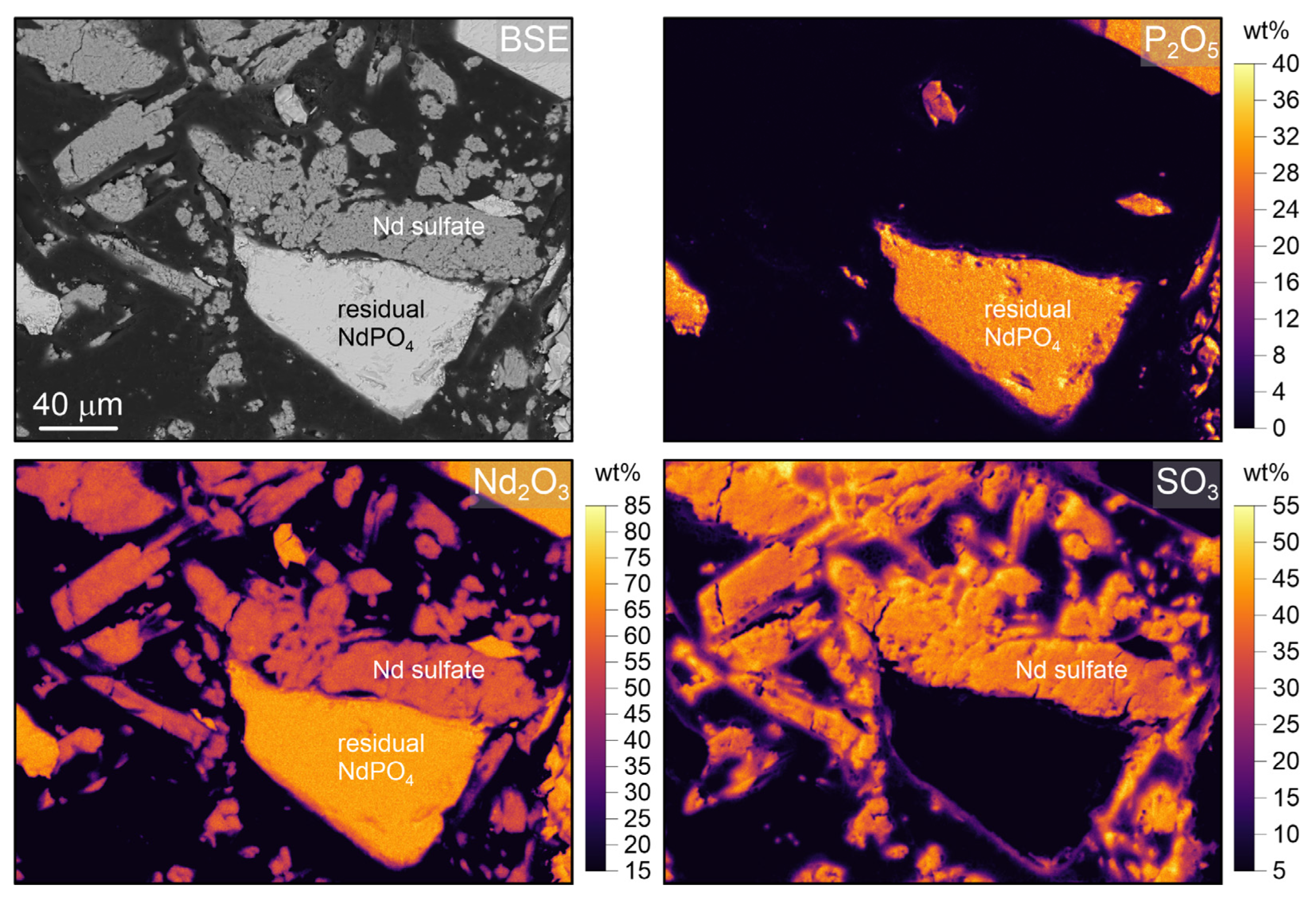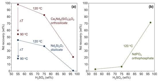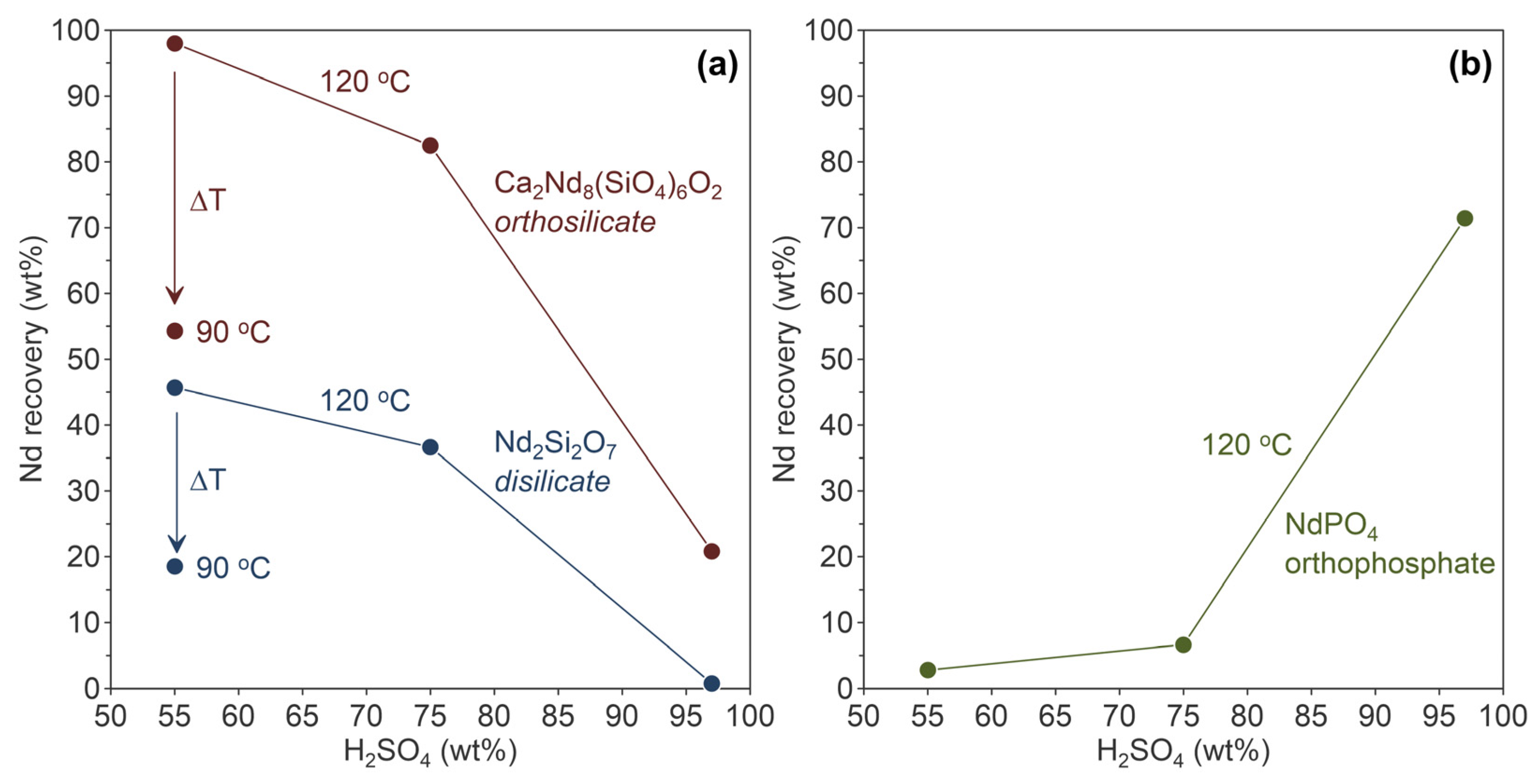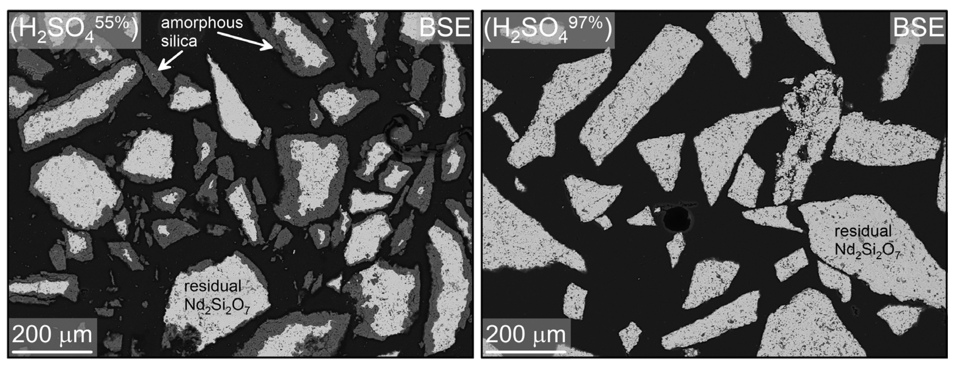 - Although the acid strength is expected to be the driver in promoting mineral decomposition, as clearly observed in NdPO4 (Section 3.3), for the silicates investigated (Section 3.1 and Section 3.2), no matter their crystalline structure and their relative chemical resistance, we observe an inverse trend with a sharp decrease in reactivity with the strongest acidic solution (H2SO497%). Consequently, there is a passivation mechanism at play that prevents efficient interaction between sulfuric acid and silicates which effect can be strongly minimized by water dilution.