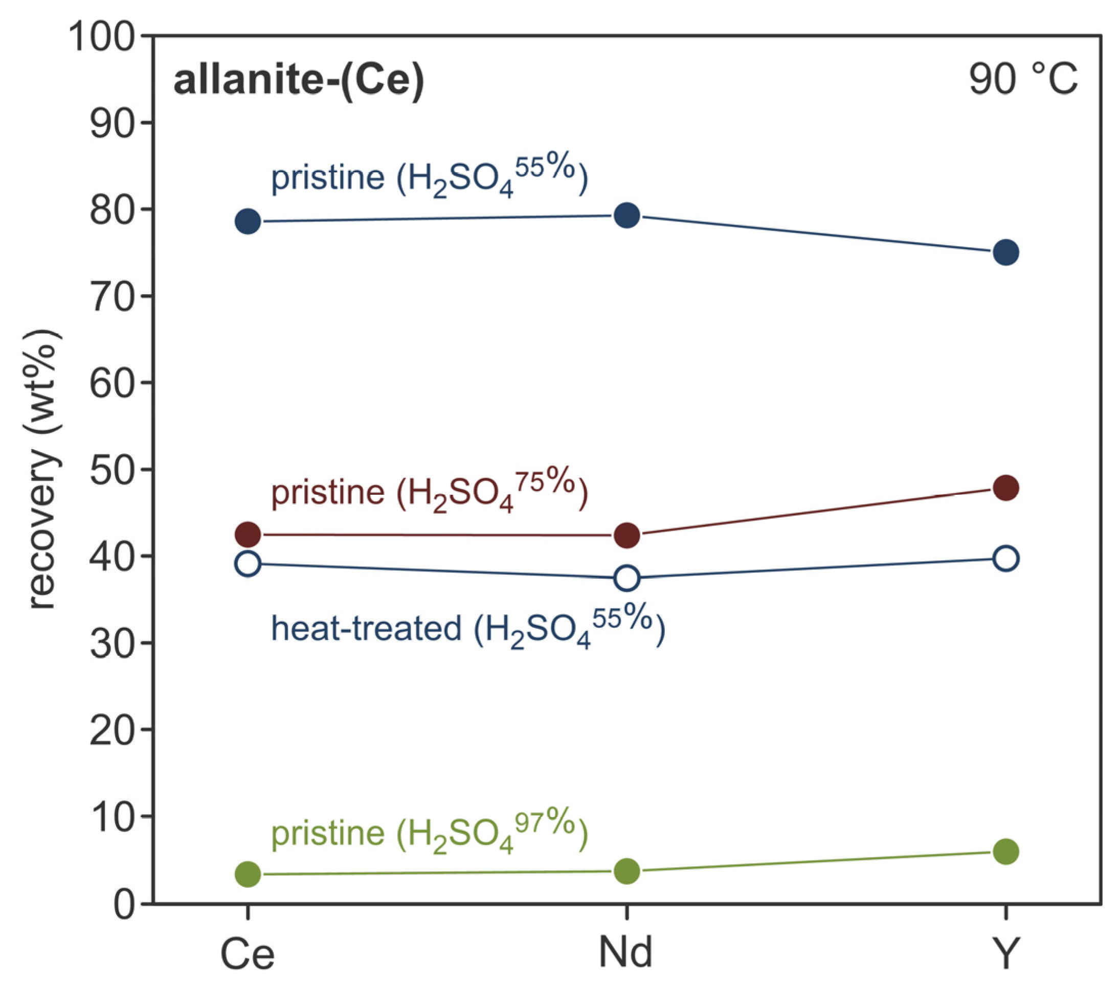 - Kӓrenlampi, K.; Vӓӓnӓnen, E.; Roivainen, T.; Perӓmӓki, P. Low temperature leaching behaviour of allanite-(Ce) in treating an allanite-concentrate by sulfuric acid. J. Sustain. Metall. 2024, 10, 1–9. [Google Scholar] [CrossRef]