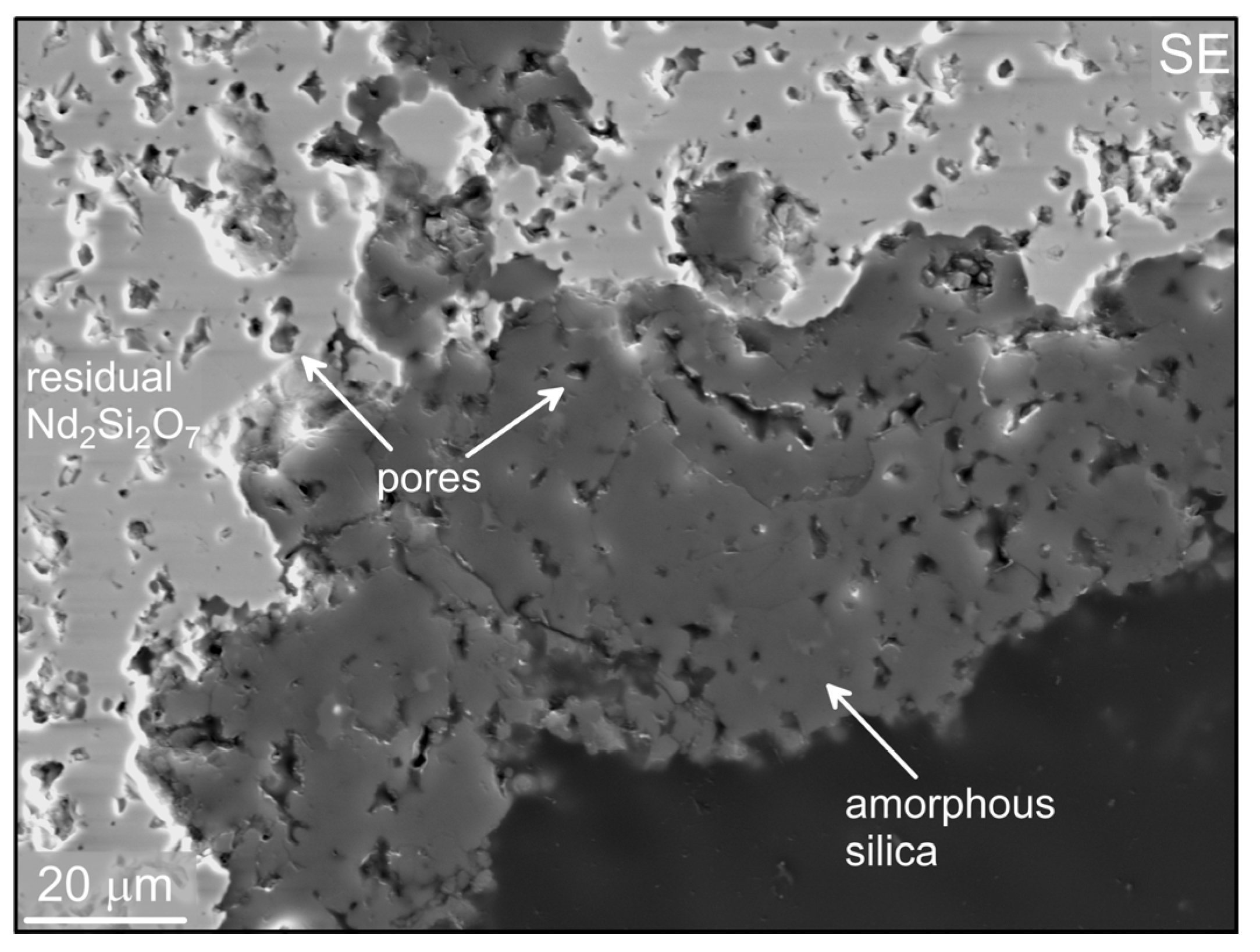 - During decomposition, there is evidence of pseudomorphic replacement by a silica layer, which can even be maintained in the case of the most depolymerized silicate structure (Figure 13) where it is tightly intergrown with the produced sulfates.