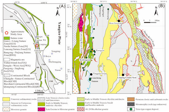 (A) Schematic diagram of Sanjiang structure [1]; (B) simplified geological map of Lanping Basin [20].