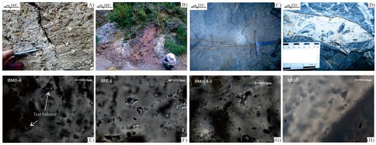 Field and microphotographic documentation of the vein-type copper deposit in the northern Lanping Basin. (A) Mineralization within a fault zone, exhibiting visible slickensides; the white arrow indicates the sliding direction. (B) The ore-hosting stratigraphic unit (Jurassic Huakai Zuo Formation). (C) A mineralized calcite vein. (D) A lenticular mineralized vein. (E–H) Primary vapor-liquid fluid inclusions trapped within ore-stage minerals.