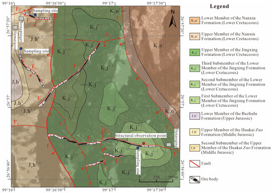 E-W trending faults are represented by the F5 and F8 faults (Figure 3). The F8 fault, the main ore-hosting structure, strikes nearly E-W (152–199°∠74–87°) with a length of approximately 2300 m, cutting through the Jurassic Huakaizuo and Cretaceous Nanxin Formations. The fault plane exhibits striations, and kinematic analysis indicates it is a dextral reverse fault. Ore bodies are strictly controlled by the F8 fault fracture zone, occurring as vein-type along the fault strike, demonstrating typical tectonic control over mineralization. The mineralized vein is hosted within tensional fractures (Figure 2C,D).