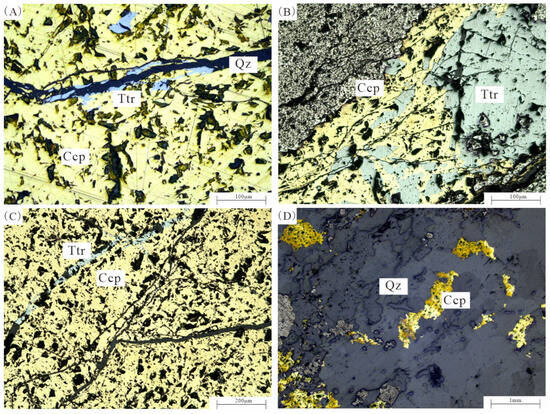 Microscopic observations (Figure 4) show that chalcopyrite and tetrahedrite coexist with clear contact boundaries, and tetrahedrite clearly postdates chalcopyrite (Figure 4A–C). As clearly shown in Figure 4A, pre-existing chalcopyrite underwent fragmentation due to later quartz vein infilling, with tetrahedrite growing along the quartz veins and replacing the chalcopyrite. Figure 4B shows residual textures of chalcopyrite altered by tetrahedrite, and Figure 4C shows tetrahedrite crosscutting chalcopyrite as late-stage veinlets. Chalcopyrite occurs as stippled distributions in the quartz matrix (Figure 4D). Based on mineral paragenesis, the deposit formation involved at least two stages of hydrothermal activity: an early high-temperature stage with chalcopyrite precipitation, and a late middle-low temperature stage with tetrahedrite replacing chalcopyrite.