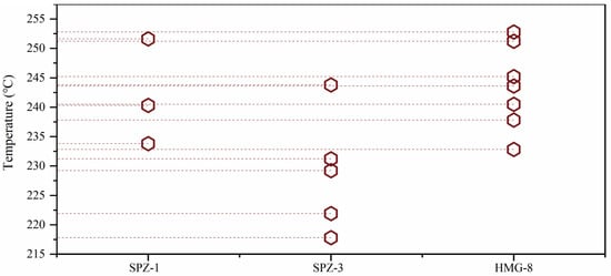 SPZ-1 has a dispersed range (220–250 °C), with a main peak at 235–245 °C, indicating multiple temperature fluctuations. SPZ-3 has the narrowest range (225–240 °C), densely distributed around 235 °C, indicating a stable hydrothermal environment. HMG-8 has a higher and broader range (230–252 °C), suggesting proximity to the hydrothermal center or deep-heat sources influence (Figure 5).