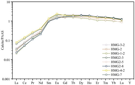 REE contents in the vein-type copper deposits calcite from the main mineralization period range from 85.87 × 10−6 to 111.86 × 10−6 (ΣREE > 50 × 10−6), with Ce/Ce* = 0.86–0.92 and Eu/Eu* = 1.06–2.99. The calculation methods for Ce/Ce* and Eu/Eu* are, respectively, dividing the normalized Ce value by the average of the normalized La and Pr values, and dividing the normalized Eu value by the average of the normalized Sm and Gd values, where normalization is performed using PAAS as the reference. The deposits are characterized by significant LREE depletion and HREE enrichment. The mass fraction ratio of Y to Ho (i.e., w(Y/Ho)) ranges from 24 to 26.2 (Table 2).
