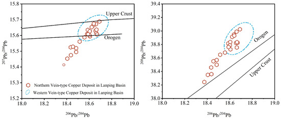 Lead pattern tracing uses the lead structural model diagram (Figure 8) [70]. On the 206Pb/204Pb–207Pb/204Pb diagram, data form a straight line with strong correlation, distributed between the orogenic belt and upper crust, suggesting a mixed source. On the 206Pb/204Pb–208Pb/204Pb diagram, all data indicate orogenic Pb as the dominant source. Samples from copper or copper-bearing polymetallic deposits within the basin show good clustering, implying similar Pb sources and a single evolutionary history (Figure 8).
