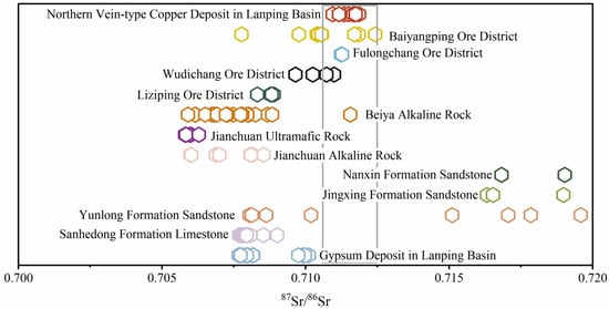 Sr isotopic comparison of vein-type copper deposits in northern Lanping Basin (except for the copper mine in the northern part of Lanping, all other data come from [8,78,87,88,89,90,91,92,93,94].).