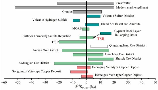 Sulfur isotope diagrams indicate a strong correlation with volcanic or igneous rocks. The δ34S distributions of the northern vein-type copper deposits are nearly identical to those of Jinman, Liancheng, and Kedengjian deposits (Figure 10), similar to granite and island arc basalt + andesite ranges. Overall, the sulfur sources of copper deposits in the northern Lanping Basin and the entire western basin result from the mixing of deep magmatic hydrothermal sulfur and the organic matter-reduced gypsum-salt sulfur (i.e., TSR).