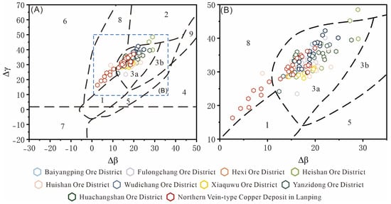 (A) Genetic classification diagram of vein-type copper deposits in northern Lanping Basin. (B) Enlarge the part within the blue dashed box in Figure 11A [1. Mantle-derived lead; 2. Upper crustal lead; 3. Subduction zone leads from upper crust-mantle mixing (3a magmatism; 3b sedimentation); 4. Chemical sedimentary lead; 5. Submarine hydrothermal lead; 6. Medium-depth metamorphic lead; 7. Lower crustal lead from deep metamorphism; 8. Orogenic belt lead; 9. Ancient shale upper crustal lead; 10. Retrogressed lead (data from Hemeigou and Songpingzi are from this study, while part of the data from Hetaoqing and other deposits are from [16,74,83,84,85,86,87,88,89,90,91,92,93]]).