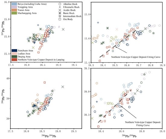 Comparison with igneous rocks and high-grade metamorphic rocks from the basin margin confirms the magmatic origin of lead. Most igneous rocks or metamorphic rocks differ from Hetaoqing, while alkaline rocks from Jianchuan, Beiya, and Yongan are similar (Figure 12). The Jianchuan Basin alkaline rocks may share the same origin as the copper deposits. Alkali-rich plutons around the Lanping Basin have ages of 50–25 Ma [105].