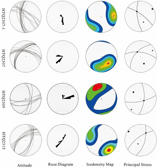 Structural analysis of the F8 fault system was conducted using FaultKin 6 and Stereonet 2020 software [110,111]; detailed occurrence data are provided in Appendix A, Table A1. Stress inversion of fault striations at HTQ2309 and HTQ2318 (Figure 13) indicates that a principal compressive stress axis (P-axis) orientation of NE-SW is 58°∠13° and a principal tensile stress axis (T-axis) of NW-SE is 160°∠42°. The stress field shows a typical thrust fault mechanism, with the P-axis nearly perpendicular to the fault dip direction.