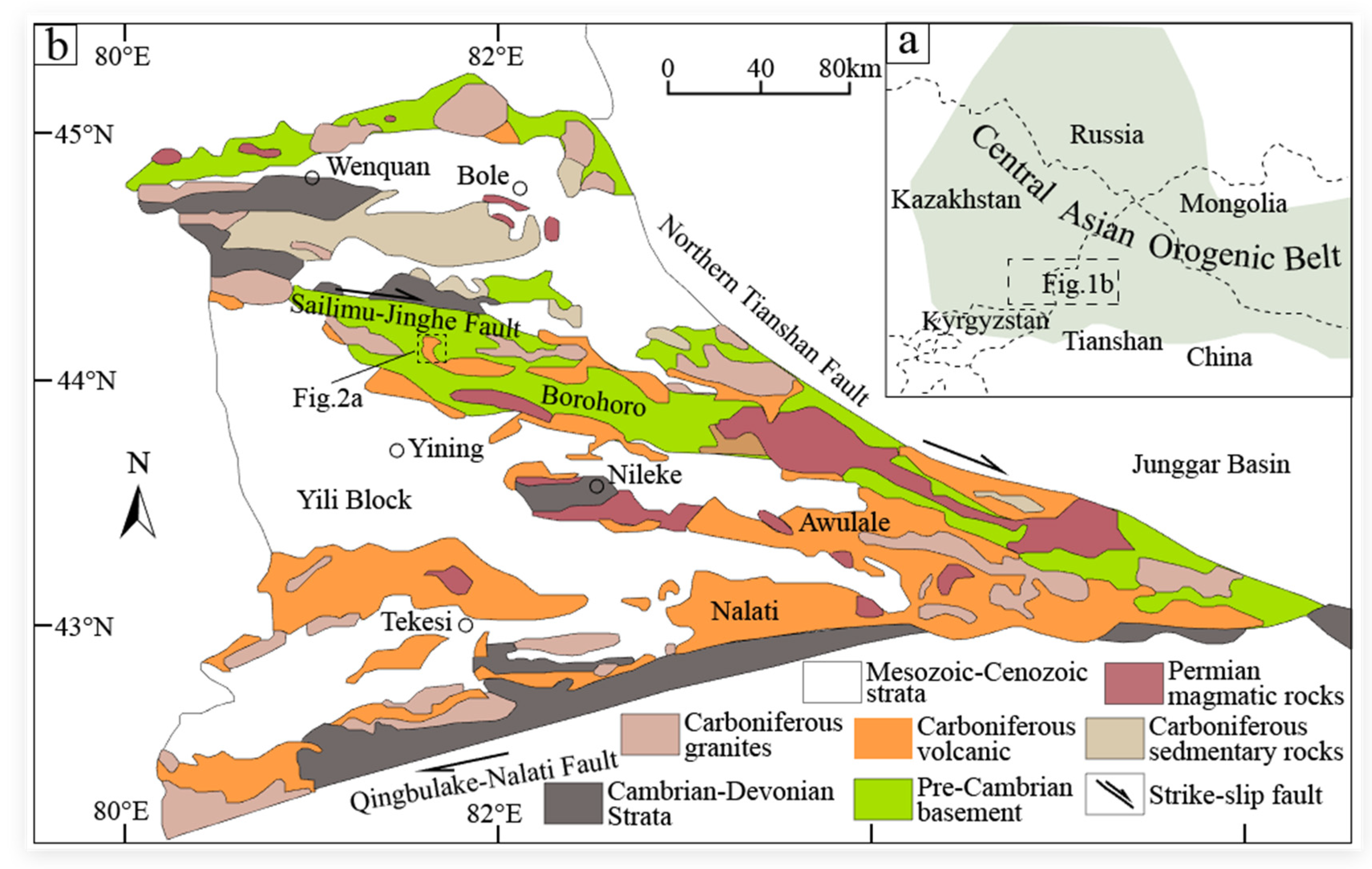 - Dong, L.L.; Wan, B.; Deng, C.; Cai, K.D.; Xiao, W.J. An early Permian epithermal gold system in the Tulasu Basin in North Xinjiang, NW China: Constraints from in situ oxygen-sulfur isotopes and geochronology. J. Asian Earth Sci. 2018, 153, 412–424. [Google Scholar] [CrossRef]