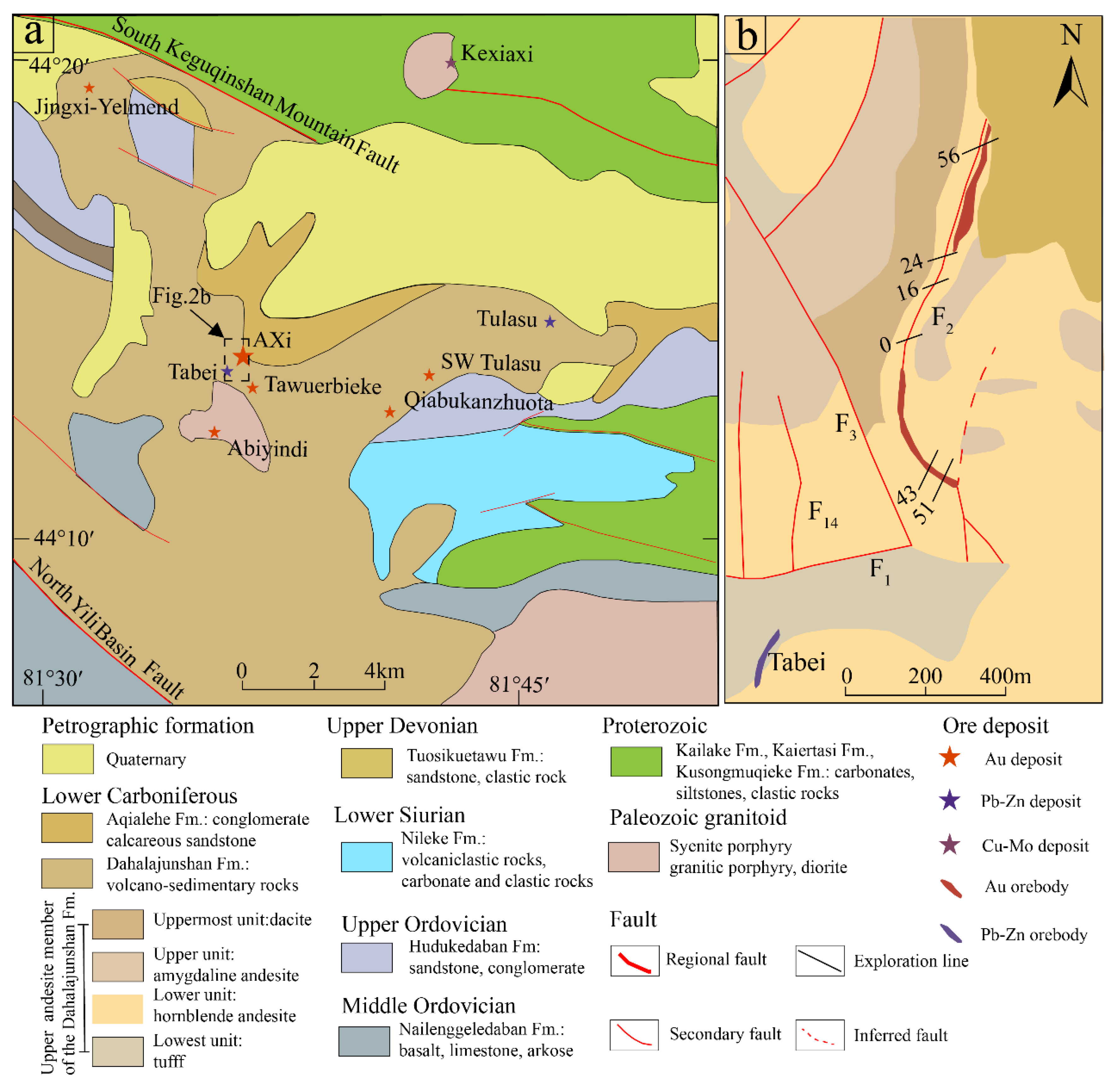 - Zhai, W.; Sun, X.M.; Gao, J.; He, X.P.; Liang, J.L.; Miao, L.C.; Wu, Y.L. SHRIMP dating of zircons from volcanic host rocks of Dahalajunshan formation in Axi gold deposit, Xinjiang, China, and its geological implication. Acta Petrol. Sin. 2006, 22, 1399–1404. [Google Scholar]