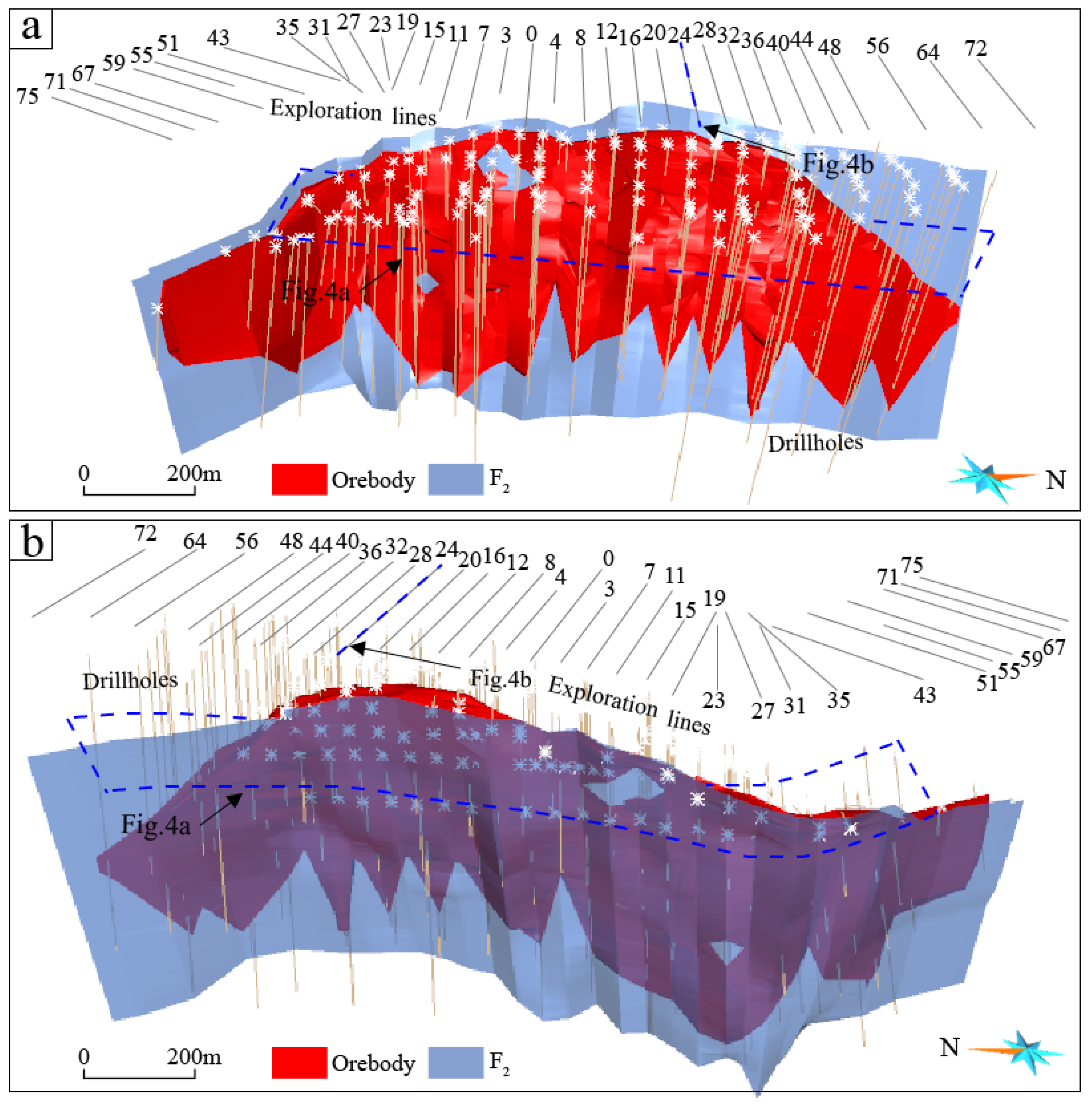 - Liu, L.M.; Li, J.F.; Zhou, R.C.; Sun, T. 3D modeling of the porphyry-related Dawangding gold deposit in South China: Implications for ore genesis and resources evaluation. J. Geochem. Explor. 2016, 164, 164–185. [Google Scholar] [CrossRef]