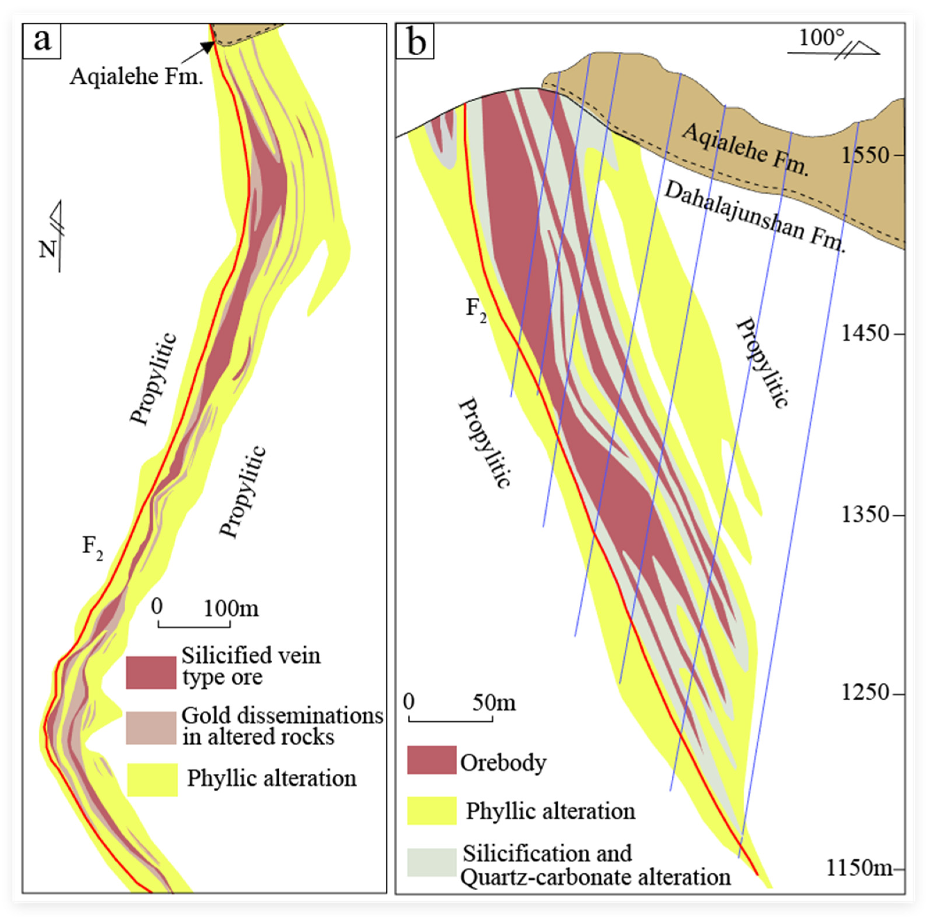 - Wei, J.L. Study of Orebody Space Location Regularity and Prospecting Direction of Axi Gold Deposit in Xinjiang Province. Ph.D. Thesis, China University of Geosciences, Beijing, China, 2013. [Google Scholar]