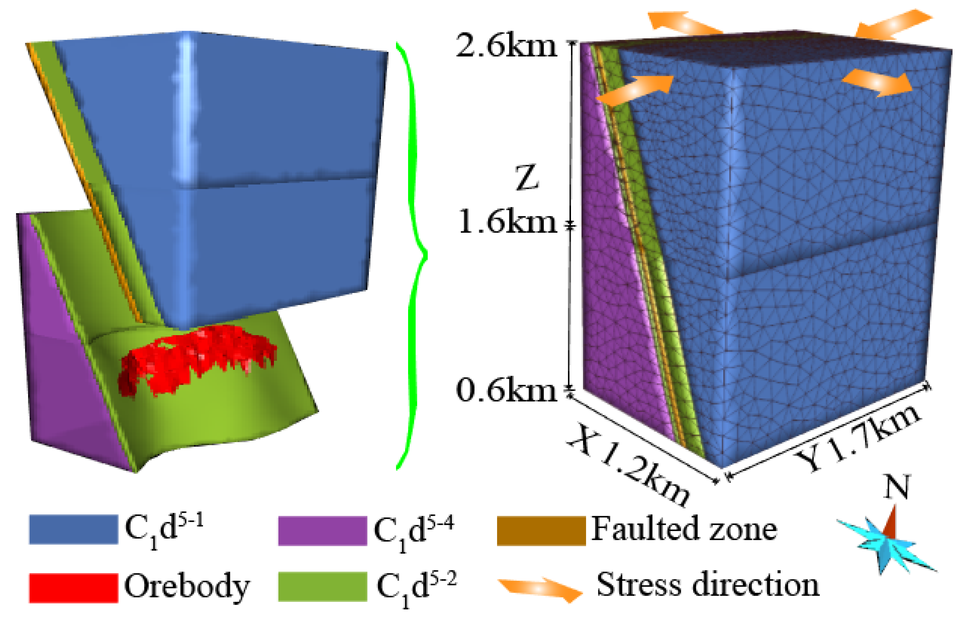 - Simultaneously, the model experiences north–south (Y-axis) compressive stress. At the top of the model, the compressive stress is set to 8.0 × 106 N/m2, and it decreases along the negative Z-axis at a gradient of 1 × 103 N/m2 per meter (Figure 7).