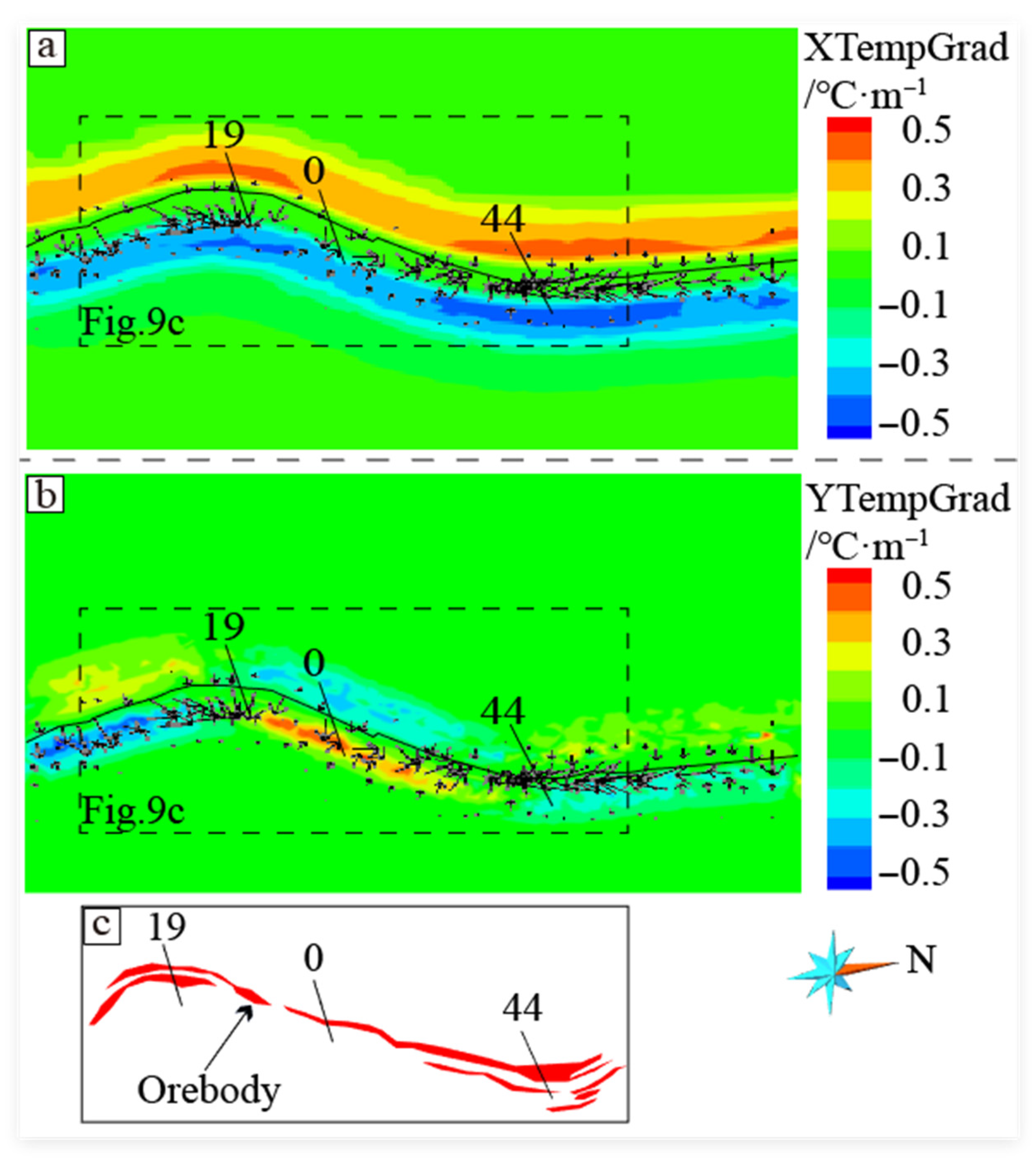 - The precipitation of mixing ore-forming fluids is preferentially localized in zones with sharp temperature gradients. Following the mixing of meteoric and magmatic fluids, pronounced temperature gradients are generated at locations with relatively large fault dips and gentle undulations. These gradients destabilize the complexes, thereby initiating efficient gold deposition.