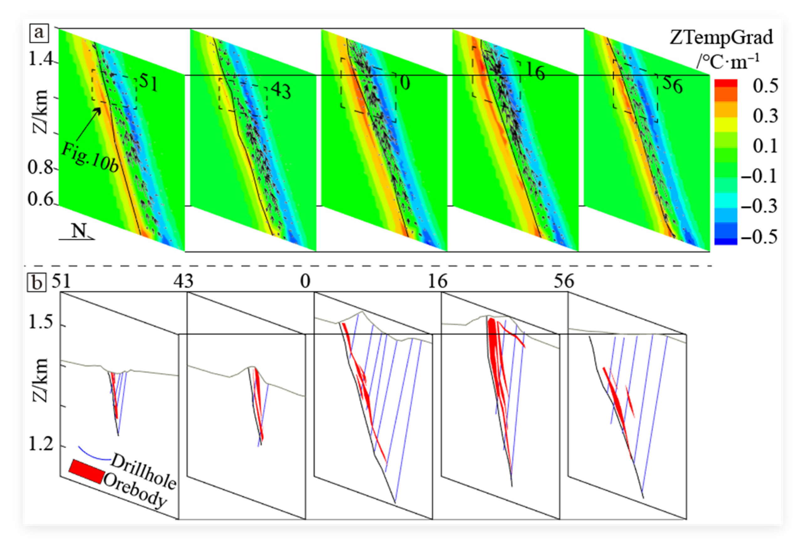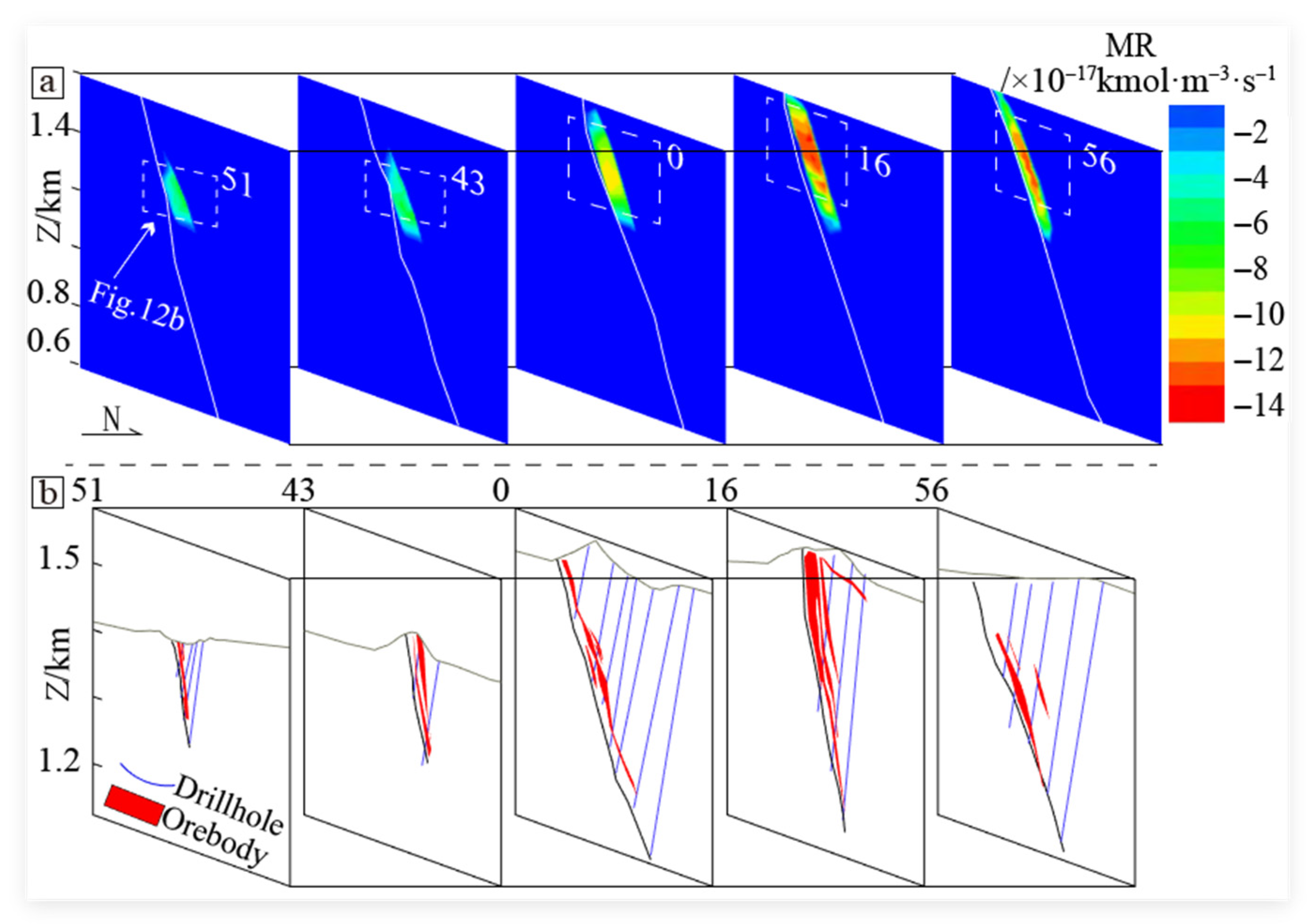 - Zou, Y.H.; Liu, Y.; Dai, T.G.; Mao, X.C.; Lei, Y.B.; Lai, J.Q.; Tian, H.L. Finite difference modeling of metallogenic processes in the Hutouya Pb-Zn deposit, Qinghai, China: Implications for hydrothermal mineralization. Ore Geol. Rev. 2017, 91, 463–476. [Google Scholar] [CrossRef]