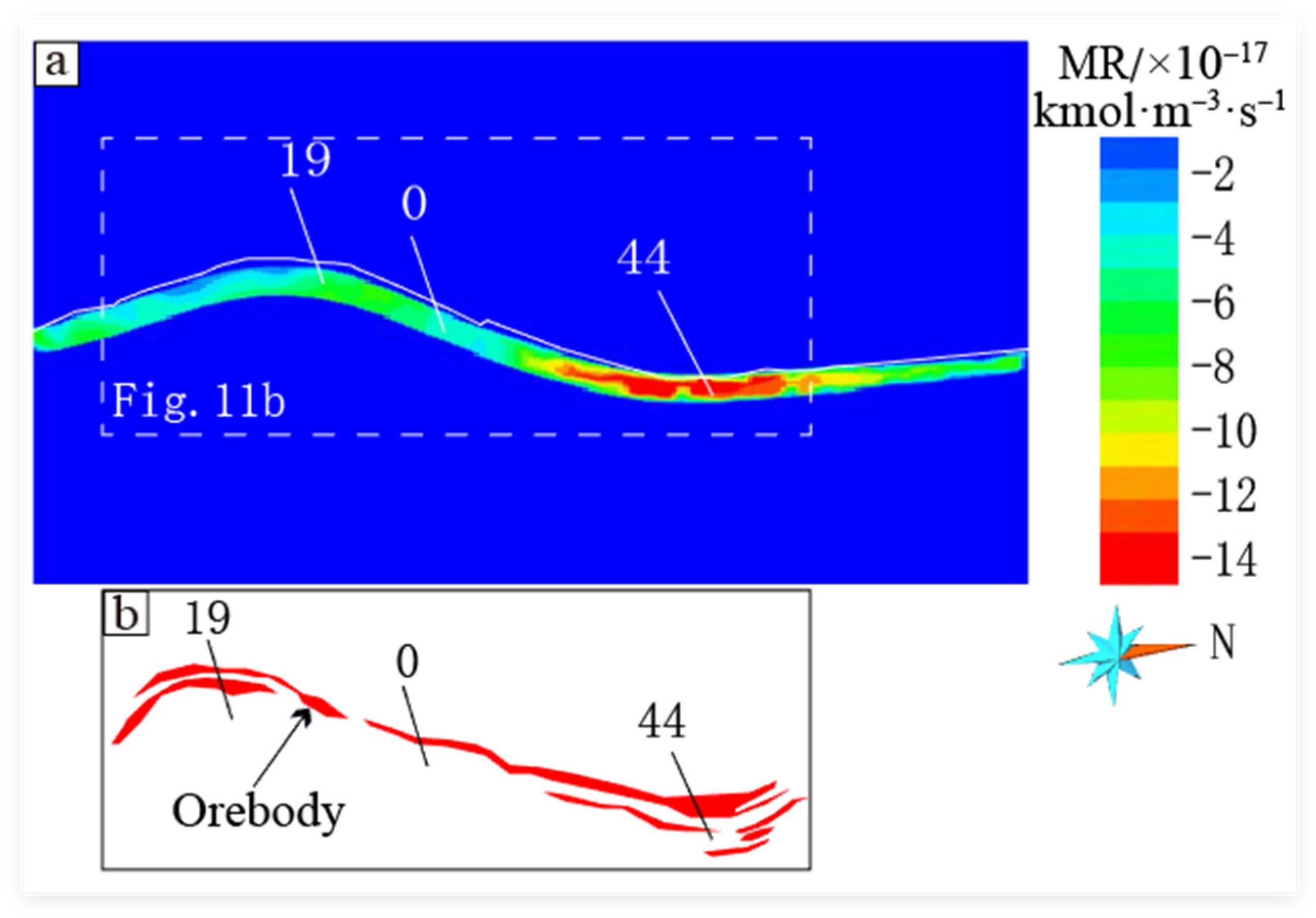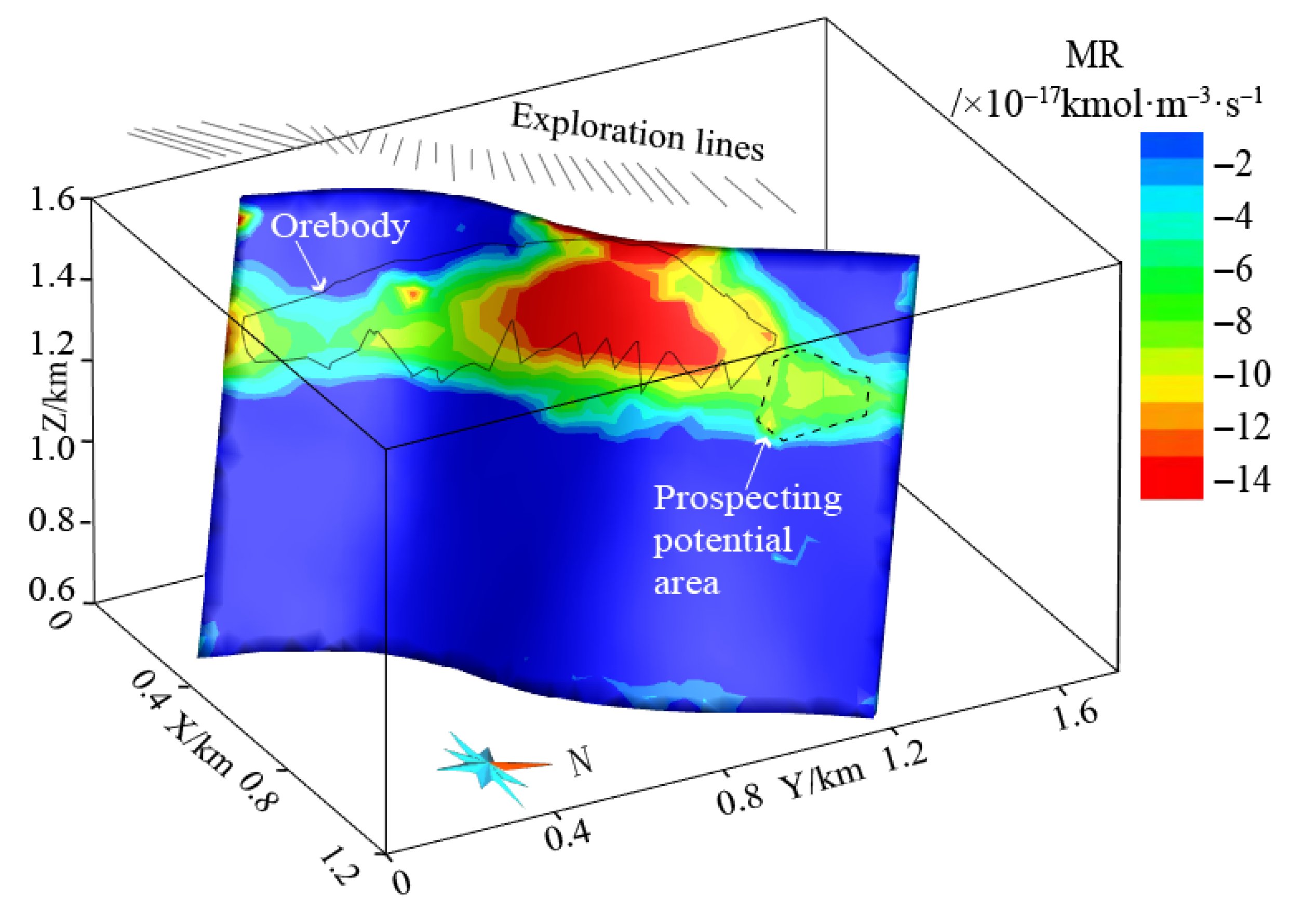 - The coupling of multiple physical–chemical processes at the same location of the fault is likely to be the key factor controlling the formation of the Axi gold deposit, as quantitatively expressed by the negative mineralization rate. Based on this metallogenic regularity, it is inferred that a potential mineralization zone has been delineated in the deep northern extension of the known ore bodies.