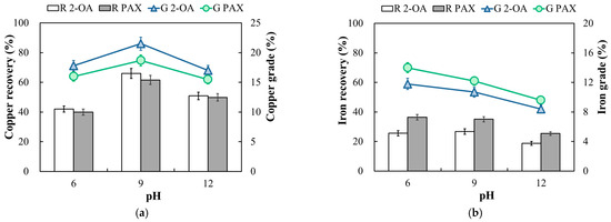 Figure 6. Effect of pH on the recovery and grade of copper (a) and iron (b) in copper ore flotation. R 2-OA and R PAX: recovery (%); G 2-OA and G PAX: grade (%). (Flotation condition: −75 μm, pulp density 10%, pH 6–12, collector 100 g/t, frother 100 g/t).