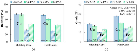 Figure 12. Effect of the addition of collector only in the roughing stage on the recovery (a) and grade (b) of copper and iron in the continuous secondary flotation of copper ore. Cu 2-OA and Cu PAX: copper recovery (%) or copper grade (%) of 2-OA and PAX; Fe 2-OA and Fe PAX: iron recovery (%) or iron grade (%) of 2-OA and PAX. Condition ①: −75 μm, pulp density 10%; roughing: pH 9, collector 100 g/t, frother 100 g/t; cleaning: pH 10, collector 0 g/t, frother 25 g/t.