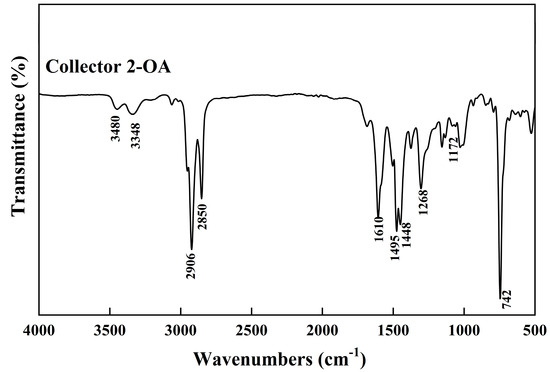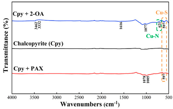 To investigate the effect of the interaction principle between the two collectors and chalcopyrite on the flotation performance, FTIR analysis was conducted on chalcopyrite before and after treatment with 2-OA and PAX, respectively. In the infrared spectrum of 2-OA (Figure 16), 3480 cm−1 and 3348 cm−1 corresponded to the symmetric and asymmetric stretching vibrations of the amino group (-NH2), respectively, while 2906 cm−1 and 2850 cm−1 were related to C-H stretching vibrations. The peak at 1610 cm−1 represented N-H bending vibrations. Peaks near 1500 cm−1 indicated skeletal vibrations of the benzene ring, and 1268 cm−1 corresponded to C-N stretching vibrations. The peaks observed at 1172 cm−1 and 742 cm−1 were attributed to the C-S (Ar–S–R skeleton) vibration. As shown in Figure 17, after chalcopyrite treatment with 2-OA, the characteristic peaks of the stretching vibration of the amino group shifted by approximately 16–18 cm−1 and the intensity of N–H bending (1610 cm−1) decreased. A slight peak appeared near 621 cm−1, which suggests that the amino group may coordinate with copper in chalcopyrite, leading to the formation of a Cu-N bond. Meanwhile, the C-S stretching vibration peak was weakened, and a new peak at 597 cm−1 was formed, indicating the combination of the thiol group in 2-OA [44,45]. This further demonstrated the significant interaction between 2-OA and the mineral surface. Furthermore, the C-H stretching peak in the 2-OA molecule also exhibited a slight shift after interaction, and the intensity of the peaks decreased, indicating that the long alkyl chain also participated in the adsorption and provided hydrophobicity, which contributed to enhanced flotation performance. This also confirmed the double-site adsorption mentioned in the zeta potential test.