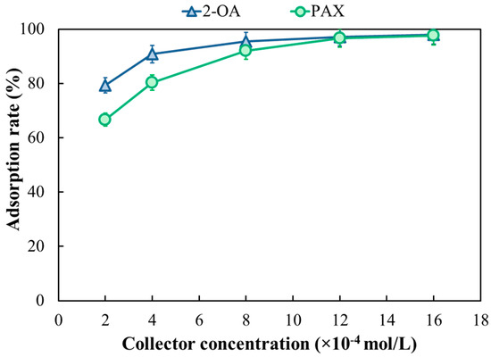 The effect of collector concentration on the adsorption rate was conducted at pH 9. As shown in Figure 19, both collectors 2-OA and PAX exhibited a similar adsorption trend with concentration, with a rapid initial increase followed by plateauing. However, 2-OA demonstrated superior overall adsorption capacity. At the same concentration, the adsorption rate of PAX was consistently lower than that of 2-OA, and 2-OA reached saturation adsorption earlier than PAX. At a concentration of merely 2 × 10−4 mol/L, 2-OA achieved an adsorption rate exceeding 80%, higher than the 67% achieved by PAX at the same concentration. When the collector concentration increased to 8 × 10−4 mol/L, the adsorption rate of 2-OA tended to level off. However, PAX approached a steady state after the concentration exceeded 12 × 10−4 mol/L. At a concentration of 16 × 10−4 mol/L, the adsorption rates of both 2-OA and PAX reached over 97%, approaching saturation. Adsorption rate is the proportion of collector molecules that can stably exist on the mineral surface. A higher adsorption rate for collector 2-OA indicated that 2-OA more fully covered the mineral surface, resulting in a broader hydrophobic region on the mineral surface. This significantly enhanced the adhesion of collectors to bubbles, thus improving the floatability [51]. For collector 2-OA, the combination of S–Cu, N–Cu bonds and ordered long-chain hydrophobic chains not only ensures high coverage but also enhances adsorption stability on copper minerals, explaining its high copper recovery and better selectivity in chalcopyrite flotation.