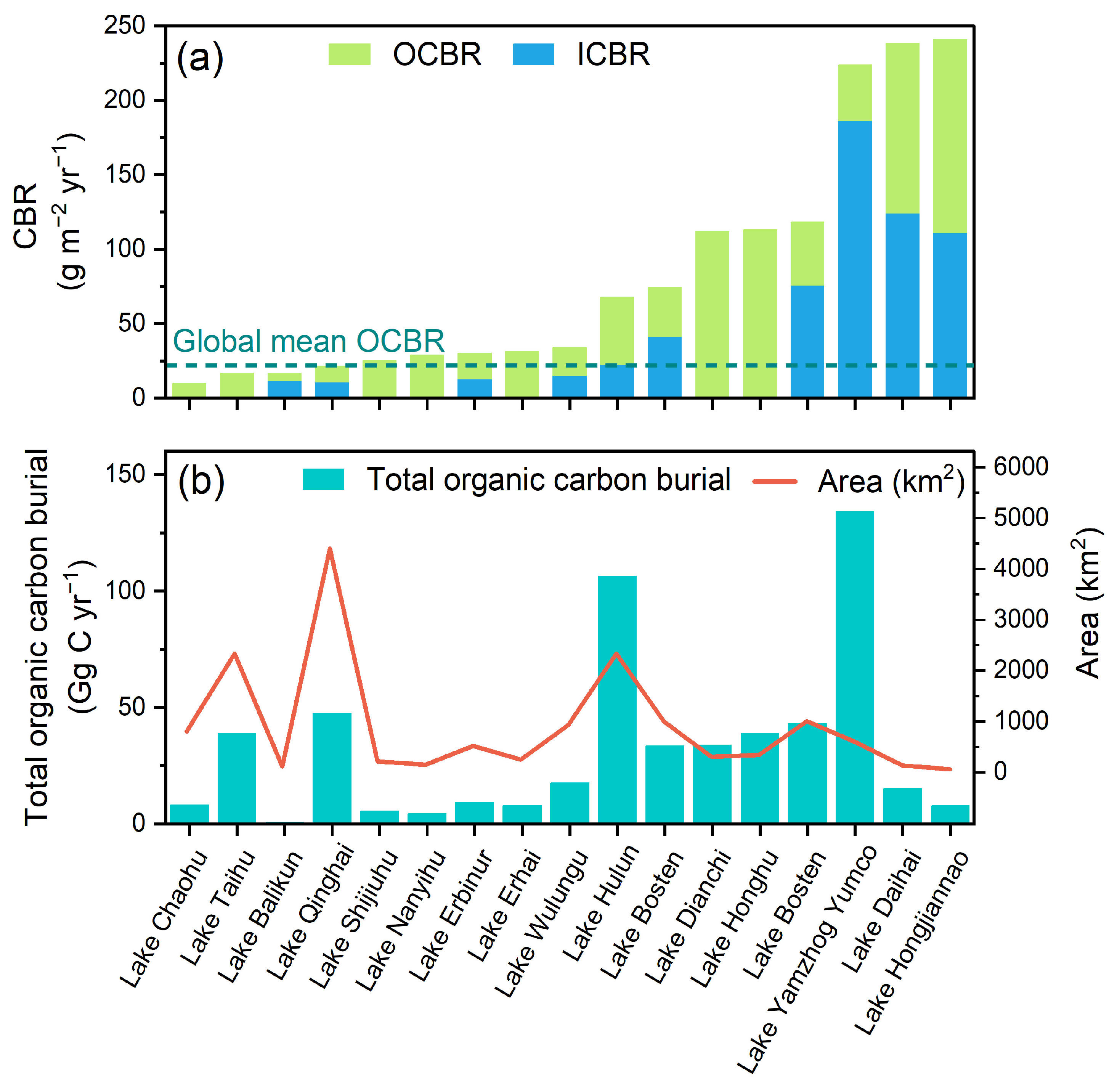 - Meng, X.; Chen, X.; Lin, Q.; Liu, Y.; Ni, Z.; Sun, W.; Zhang, E. Spatiotemporal patterns of organic carbon burial over the last century in Lake Qinghai, the largest lake on the Tibetan Plateau. Sci. Total Environ. 2023, 860, 160449. [Google Scholar] [CrossRef] [PubMed]