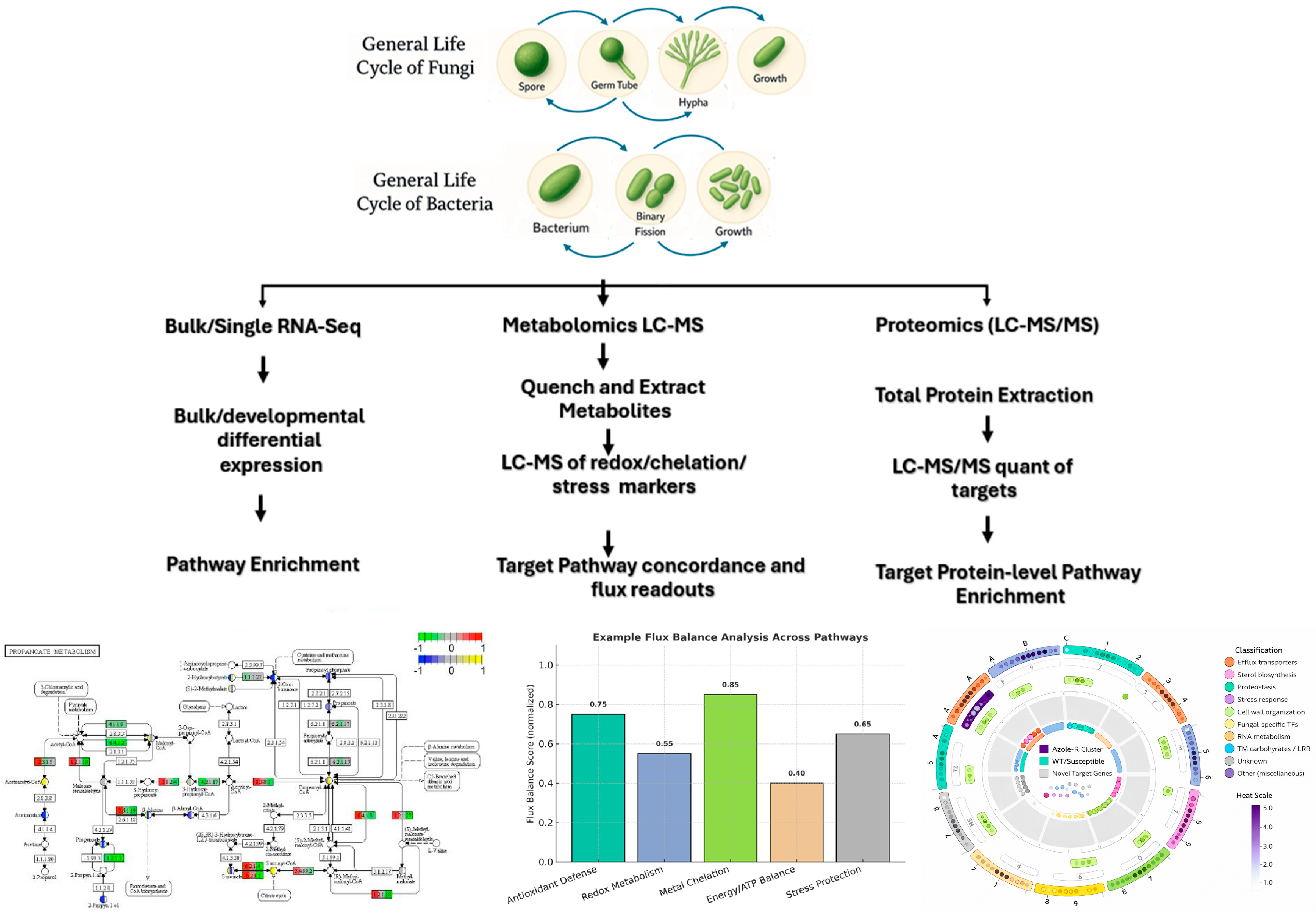 For eukaryotic microorganisms, such as fungi, RNA-seq analysis follows a fundamental workflow similar to that of bacteria, but it requires specific tools to effectively process spliced transcripts. A recent comprehensive study conducted by Jiang et al. [53] on plant pathogenic fungi offers valuable insights for improving this process. The process starts with trimming reads with fastp, where parameters are selected based on the data characteristics. Reads are then aligned to a reference genome using HISAT2, a tool selected for its good balance of speed and accuracy. Gene-level quantification is typically performed using alignment-based tools, such as featureCounts, which have demonstrated strong performance. The next step involves the statistical analysis of identifying differentially expressed genes (DEGs), for which DESeq2′s parametric fitting method is recommended due to its robustness across fungal datasets. Beyond constructing a custom pipeline, integrated platforms like FungiDB compile pre-processed differential expression outcomes, enabling researchers to investigate, for instance, genes that are upregulated under metal stress [49,52]. Regardless of the organism’s kingdom, the precision of transcriptomic analysis relies entirely on a high-quality, thoroughly annotated genome, highlighting the essential role genomics plays in the multi-omics approach.