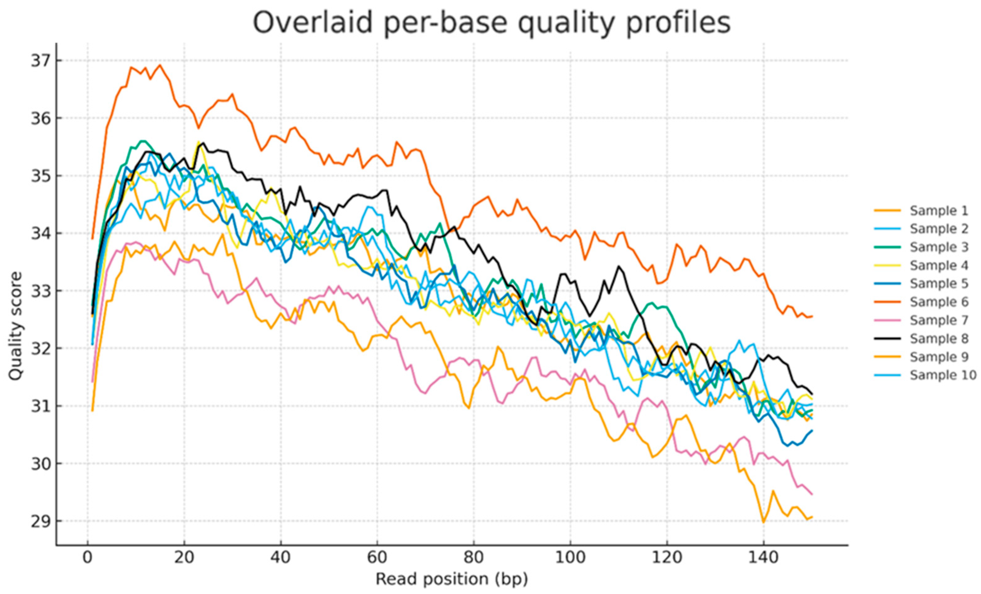 Figure 2. Overlaid per-base quality profiles for ten samples. Phred scores by read position show high 5′ quality with a gradual decline towards the 3′ end.