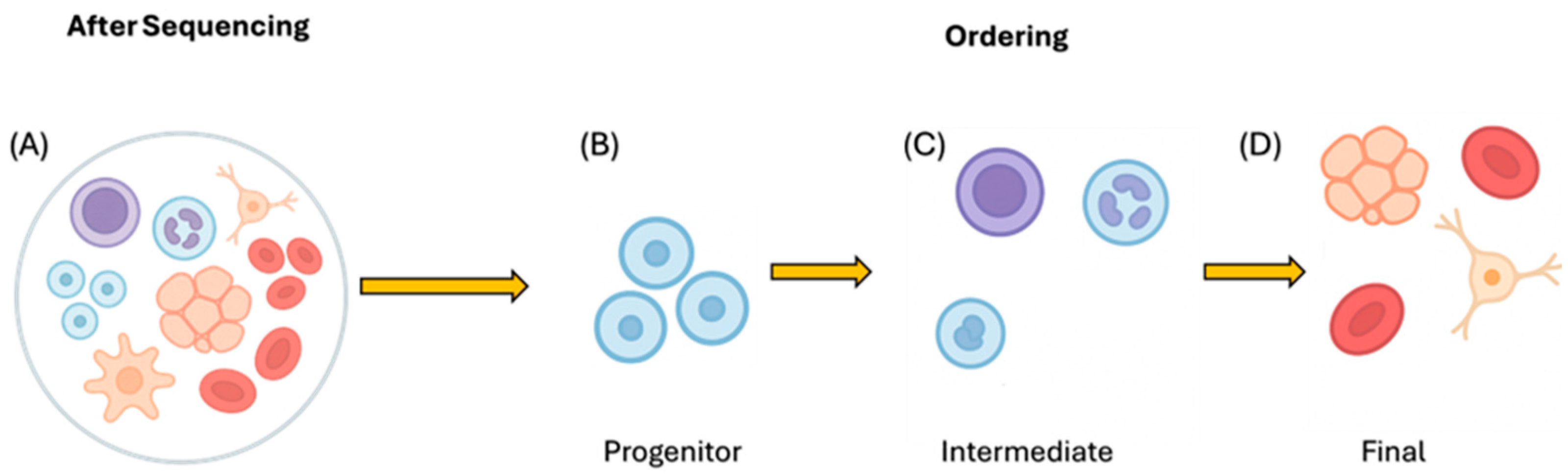 Figure 3. (A) Mixed tissue with diverse cell types. (B) Early/progenitor subset isolated or computationally enriched. (C) Cells arranged in low-dimensional space and ordered along trajectories, revealing intermediates. (D) Terminal, lineage-specific outcomes (e.g., erythroid, epithelial, neuronal). Arrows indicate progression from progenitor → intermediate → mature states.