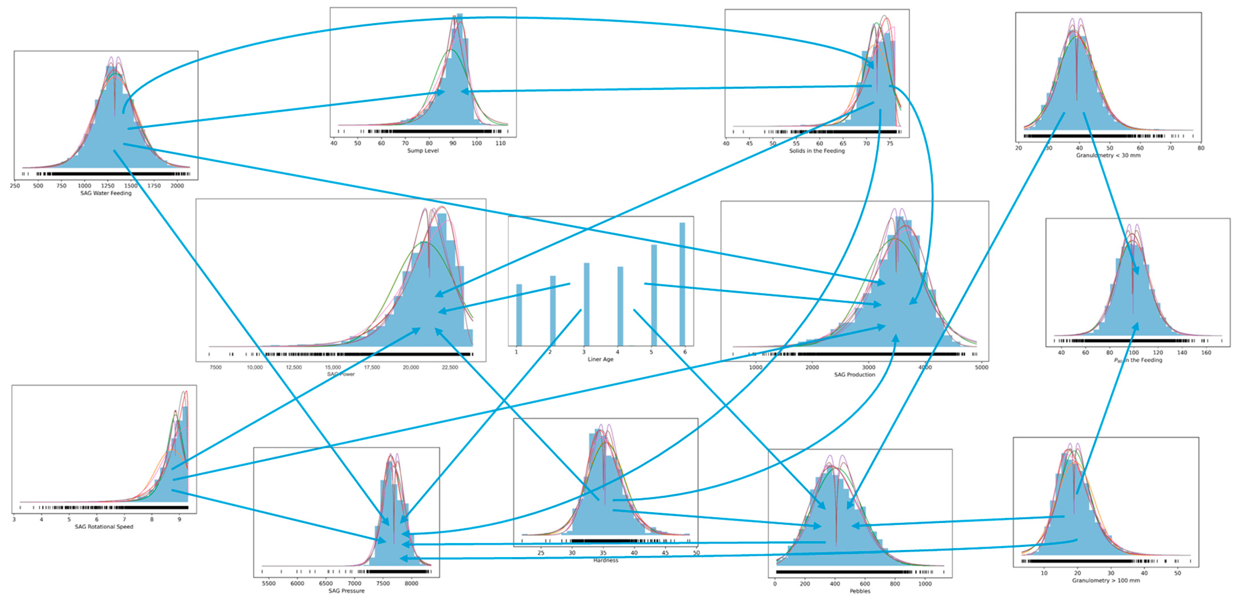 - Identifying relationships with lags will require time-shifts and/or dynamic models (DBN) to capture delayed effects (e.g., stockpile → PSD → SAG Production).