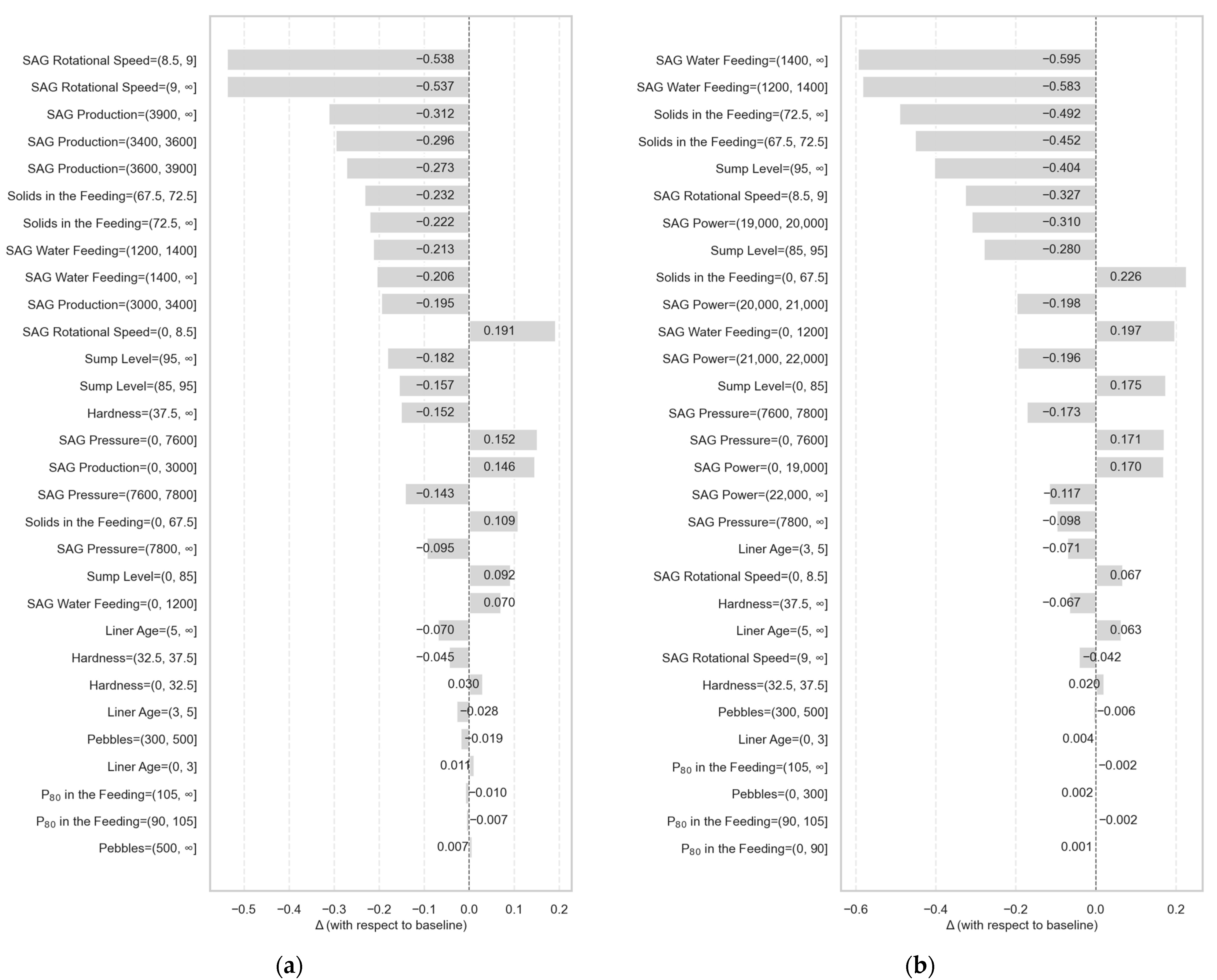 - Scenario 2—Increasing water feeding while decreasing solids, representing a more dilute pulp regime. In this case, SAG Production increases (Δ ≈ +0.56), whereas SAG Power remains unchanged relative to the baseline (Δ ≈ 0). This behavior is consistent with improved material transport rather than increased mechanical load. The additional water does not lead to higher power consumption, which is expected since power draw is primarily governed by the mass of material being lifted and impacted inside the mill, rather than by slurry volume alone. However, it does result in a clear increase in SAG production (+0.56), as higher water addition enhances slurry mobility and a lower solids content reduces pulp viscosity, leading to improved flow conditions and faster material evacuation.