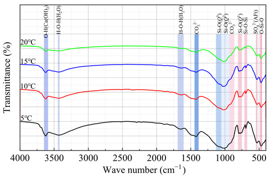 Figure 4 shows the FT-IR spectra of CPBs under different curing temperatures. It can be seen that the FT-IR spectra of hydration products of CPBs under different curing temperatures are basically the same. A clear absorption peak appeared at 3590–3650 cm−1, which is the stretching vibration of O-H bonds in Ca(OH)2. Weak bands around 3430 cm−1 and 1650 cm−1 are observed in all samples, which are related to the stretching and bending vibrations of the H-O-H bonds in the adsorbed water molecules in the hydration products. Under low curing temperatures, the spectral bands of H-O-H bonds in CPBs were significantly enhanced, which is explained by the stronger binding between water molecules and the main structure, i.e., the hydrophilicity of C-S-H is slightly enhanced under low curing temperature. In addition, the absorption peak at 530 cm−1 corresponds to the bending vibration of SO42− in the molecular structure of ettringite, and there is a weak absorption peak at 1030 cm−1 corresponding to the asymmetric stretching vibration of SO42− in the molecular structure of ettringite. The absorption peak at 1420 cm−1 corresponds to the asymmetric stretching vibration of CO32−; the weak absorption peak at 875 cm−1 corresponds to the out of plane bending vibration of CO32−, which is related to the carbonization of the sample exposed to air [35,36].