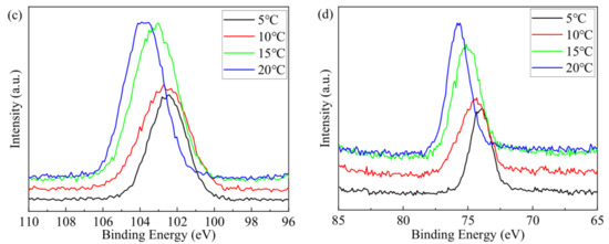 Dicalcium silicate and tricalcium silicate tend to have low Si 2p binding energies, while the Si 2p binding energy of C-A-S-H is higher. At lower curing temperatures, the hydration reaction inside CPBs is incomplete, resulting in a lower degree of polymerization of the chain silicate formed, leading to a lower binding energy of Si 2p orbitals. As shown in Figure 5d, with the increase in curing temperature, the main peak of Al 2p binding energy gradually shifts towards higher fields. Aluminum oxygen tetrahedra [AlO4] and silicon oxygen tetrahedra [SiO4] have similar structures, with binding energies ranging from 73.40 to 74.55 eV and 74.10–75.00 eV for [AlO4] and [AlO6], respectively. When the aluminum content is high, due to the stronger negative charge carried by the aluminum oxygen tetrahedra [AlO4], the balance of the [SiO4] network itself deteriorates. In order to maintain the balance of the system, some aluminum becomes six-coordinated. The observed shift in the Al 2p peak to higher binding energy could be interpreted as more aluminosilicates undergoing depolymerization during the hydration reaction to form [Al(OH)6]3− groups, which combine with Ca2+ and SO42− to form complex salt minerals such as ettringite.