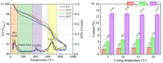 where MH2O, MCH, and MCC represent the molar masses of bound water, Ca(OH)2, and CaCO3, respectively. Figure 6b shows the content of bound water, Ca(OH)2, and CaCO3 in CPBs under different curing temperatures. The internal bound water content and CH content of CPBs are closely related to the curing temperature. As the curing temperature increases, the hydration degree of cement in CPBs increases, producing more hydration products such as C-S-H and Ca(OH)2. More free water is converted into bound water in the hydration products. The mass loss of CPBs at 30–110 °C for the four curing temperatures is 1.55%, 1.32%, 1.24%, and 1.26%, respectively. As the curing temperature increased from 5 °C to 20 °C, the content of free water inside CPBs decreased by 18.84%, the content of bound water increased by 35.49%, and the content of Ca(OH)2 increased by 28.86%. In addition, a large amount of CaCO3 is found in the TG results, which is due to the inevitable carbonization during the curing process of CPBs and the preparation process of TG test samples.