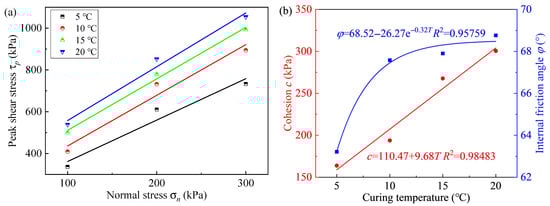 where τp is the peak shear strength, kPa; σn is the normal stress, kPa; R2 is the correlation coefficient. According to Equation (8), the cohesion and internal friction angle of CPBs under different curing temperatures are obtained, as shown in Figure 9b. When the curing temperature increases from 5 °C to 20 °C, the cohesion of CPBs are 163.83 kPa, 193.82 kPa, 267.74 kPa, and 300.55 kPa, respectively, and the internal friction angles are 63.21°, 67.58°, 67.90°, and 68.76°, respectively. As the curing temperature increases, the cohesion of CPBs shows a linear increase trend and the internal friction angle shows an exponential increase trend.